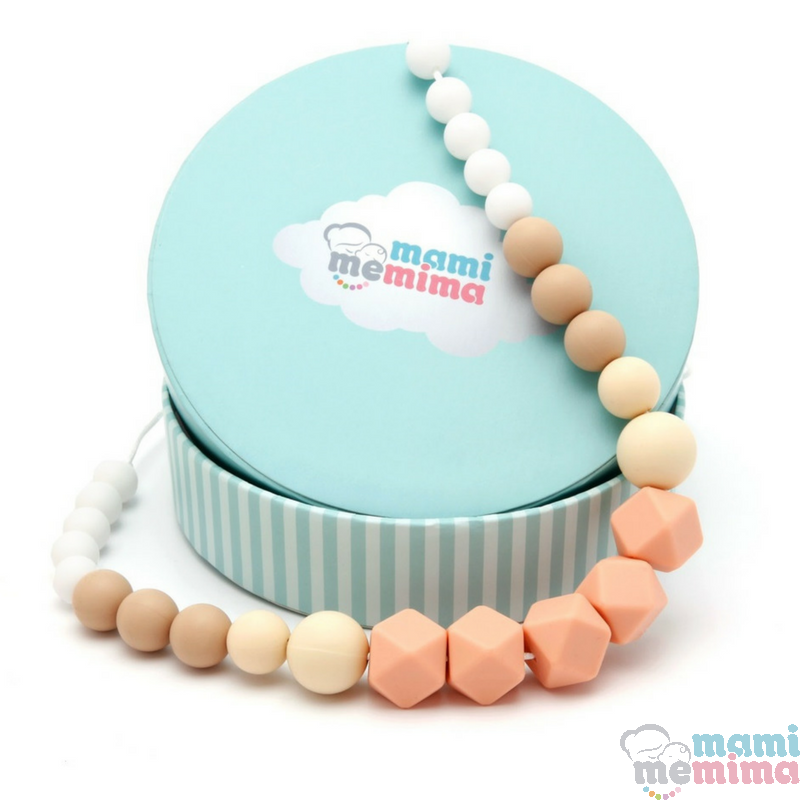 Collar de lactancia mordedor de silicona alimentaria antibacteriana libre de BPA que alivia los dolores de encías del bebé en la etapa de dentición Certificado en puericultura por Aiju. Cumple la normativa Europea En 71 - 1:2014 y En 71 - 2:2011 + A1:2014 Hecho en España.