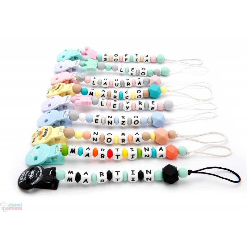 Pack de 15 chupeteros de silicona personalizados con el nombre del bebé + 12 mordedores y sonajeros de regalo.