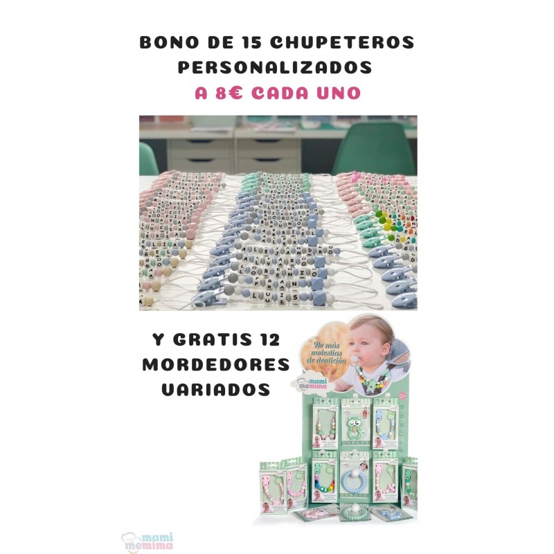 Pack Profesional 15 Chupeteros de Silicona Personalizados + 12 Mordedores y Sonajeros de Regalo