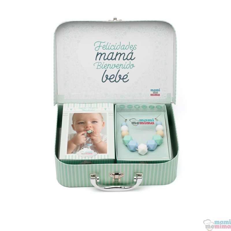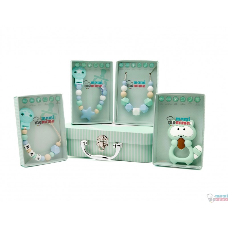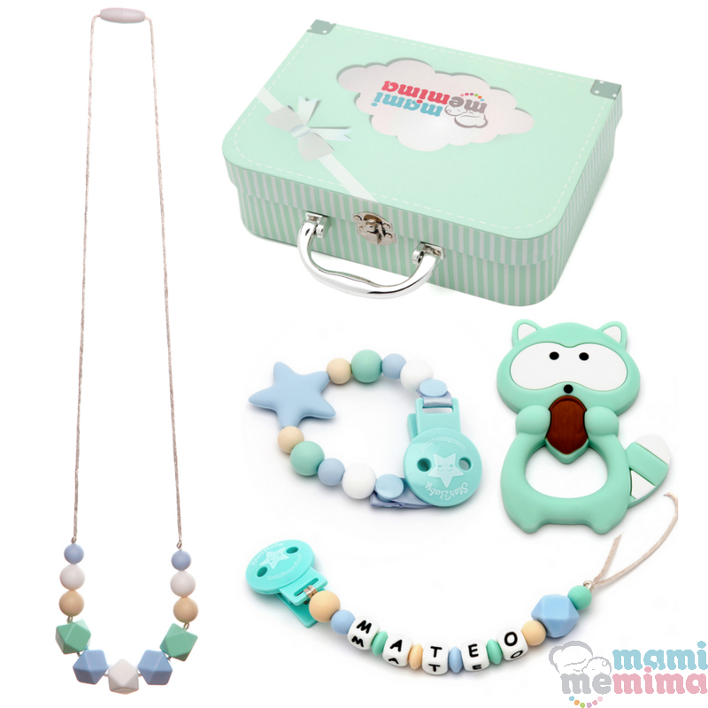 Composé par Collier anneau de Dentition, un Chupetero Mordeur Personnalisé avec le Nom du Bébé, Chupetero Mordeur avec une Étoile, une Dentition de Bébé Raton laveur et une belle Boîte étui pour ranger tous les Souvenirs de Bébé.