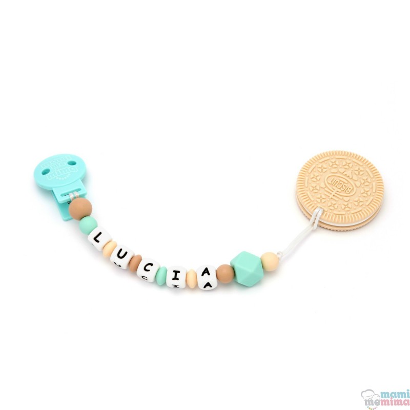 Confezione regalo con anello dentizione a forma di biscotto e sujetachupetes 100% Mordisqueable Silicone alimentare antibatterico BPA-free.