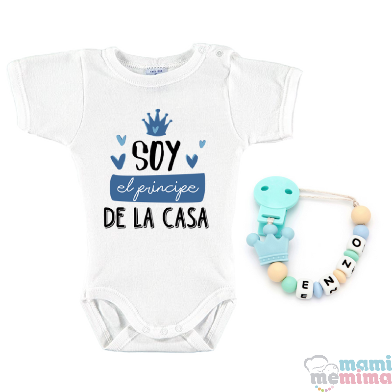 Pacote Corrente de Chupeta Personalizada Com o Nome "Prince" + Body Bebê Personalizado "Principe da Casa Azul"