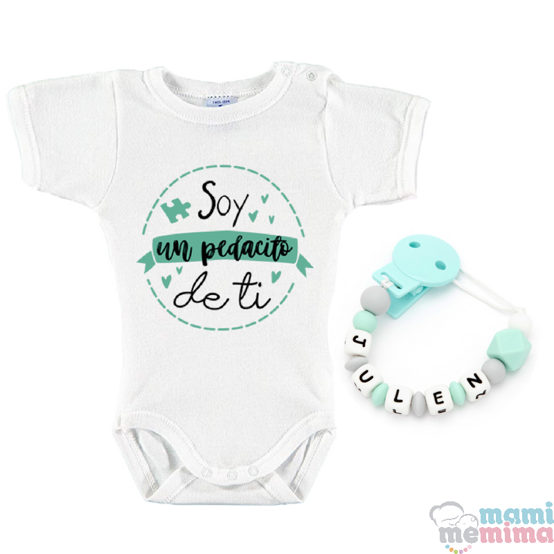 Pacote Corrente de Chupeta Personalizada Com o Nome "Sweet Mint" + Body Bebê Personalizado "Eu sou um pedaço de você"